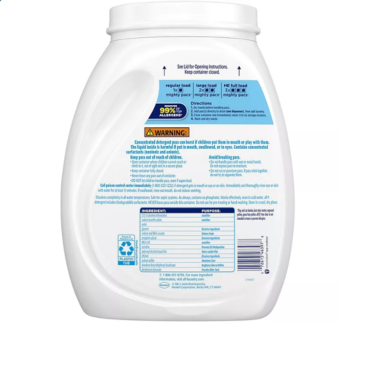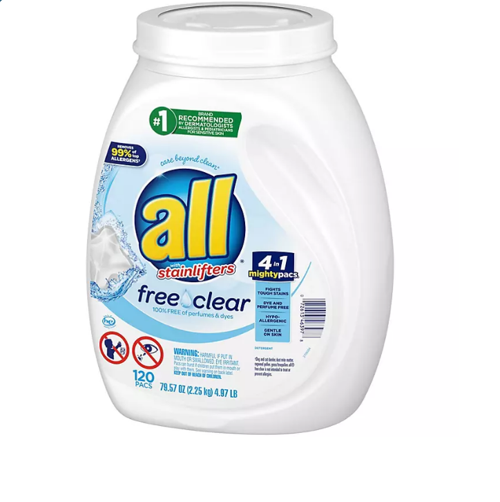 all? Mighty Pacs? are 100% free of perfumes and dyes with concentrated cleaning power in a convenient pac. All free clear is the #1 recommended detergent brand by dermatologists, allergists and pediatricians for sensitive skin. These hypoallergenic Mighty pacs are tough on stains but gentle on skin. Use with all free clear fabric softener and dryer sheets for clean and soft clothes with static cling reduction in the dryer. All free and clear mighty pacs are unscented, fragrance free and safe to use in any washing machine including high efficiency (HE) and at any water temperature. This pack contains one tub of 120 all free clear mighty pacs, with one regular load per pac.
