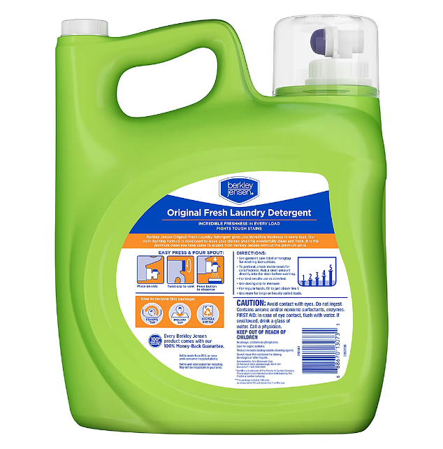 Berkley Jensen Original Fresh Liquid Laundry Detergent gives you incredible freshness in every load. Our stain-fighting formula is developed to leave your clothes smelling wonderfully clean and fresh. It is 200 fl. oz. of Berkley Jensen’s Liquid Laundry Detergent for 146 loads* of the premium clean you have come to expect from Berkley Jensen without the premium price. Berkley Jensen’s Original Fresh Scented Laundry Detergent is safe for all washers, standard and HE, and contains no phosphates. This bottle is made from 25% or more post-consumer recycled plastic; see back-of-pack for directions on how-to recycle. Every Berkley Jensen product comes with our 100% Money-Back Guarantee.