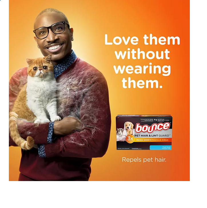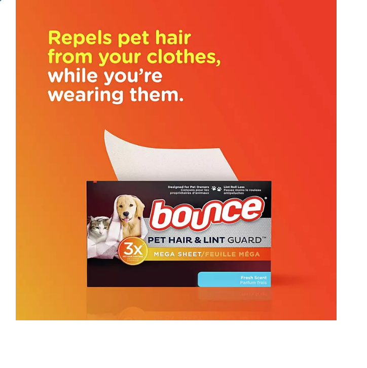 Give your furry friends a hug! Bounce Pet Hair + Lint Guard Mega Dryer Sheets repel pet hair from your clothes, before it sticks, so you can enjoy cuddling and snuggling with your pet. One Bounce Pet Hair + Lint Guard Mega Sheet has 3x the hair and lint fighting ingredients compared to the leading dryer sheet*. Two-times the size of most dryer sheets, just toss a new Bounce Pet Hair + Lint Guard Mega Sheets into the dryer and watch it bounce out pet hair and lint. Bounce dryer sheets also reduce wrinkles and static while adding extra softness and providing your clothes with the Bounce Dryer Sheets Fresh Scent you love. Bounce Mega Sheets are safe for all washables but should not be used on children’s pajamas or other garments marked flame resistant. Bounce Mega Sheets should be used on a low heat setting for synthetics. Keep out of reach of toddlers and pets to keep everyone safe. Formula made with 100% renewable wind power electricity; you can feel good in your clothes while doing good for the environment. Thanks to Bounce Pet Hair + Lint Guard Mega Sheets, you can love your pet and lint roll less.??
