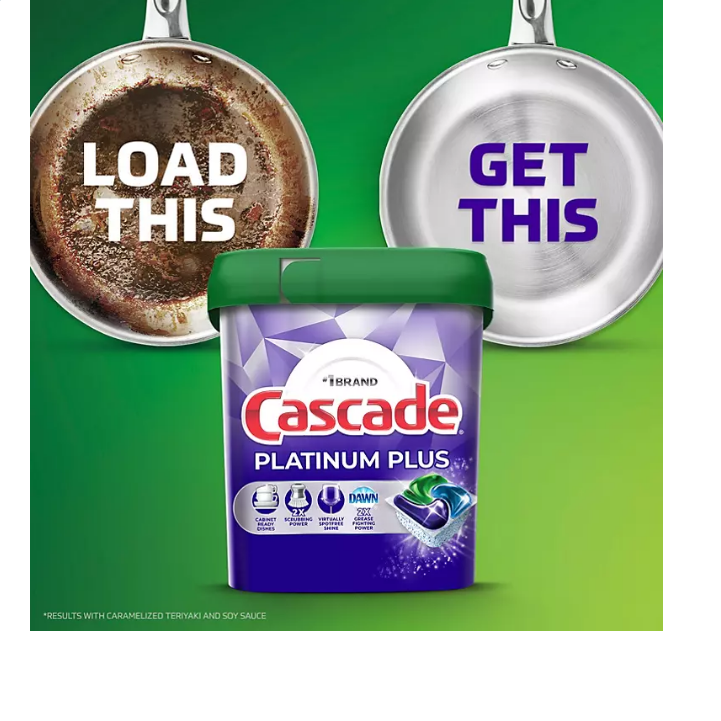 Cascade Platinum Plus ActionPacs are loaded with 2x* the Dawn grease fighting power and 2x* the scrubbing power to help power through dried on food and even the toughest messes. The ActionPacs come with a 40% larger liquid top for added cleaning that still fits in your dishwasher detergent dispenser.