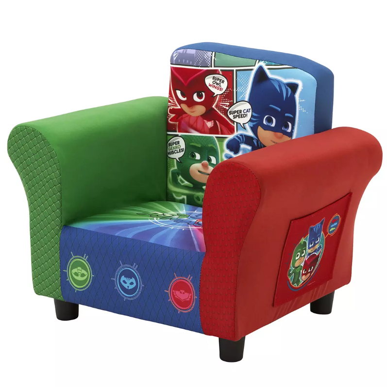 Ready to save the day, this PJ Masks Upholstered Chair from Delta Children is a great place to rest after a busy night solving mysteries and eradicating mayhem. Covered in colorful graphics of your child’s favorite heroes, Catboy, Owlette and Gekko, this sweet chair is full of super fun style. Built for years of use, the chair features a sturdy hardwood frame, storage pockets on both sides and a padded seat that is perfectly sized for your growing toddler.