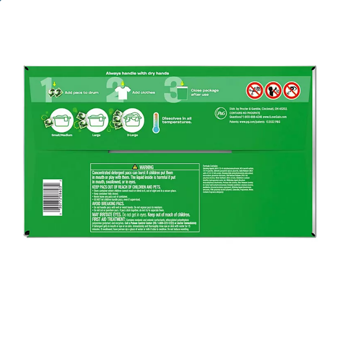 Using Gain flings laundry detergent pods is easy and mess free! They even work in all washing machines, water temperatures, and is safe to use on all fabric types. Save money by switching to cold wash! Simply add this convenient pre-measured pac to an empty drum, add your clothes and start your wash. One pac for most small to medium sized loads, two pacs for large loads, and three pacs for extra-large loads.