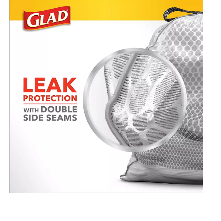 These 13-gallon kitchen trash bags are dual-layered with a unique hexagon pattern to provide complete protection against your toughest kitchen disasters. The outer layer is equipped with LeakGuard and double-sided seams for added leak protection, while the inner RipGuard layer stretches to prevent rips and tears with the trusted stretchable strength of Glad’s ForceFlex Plus technology.?