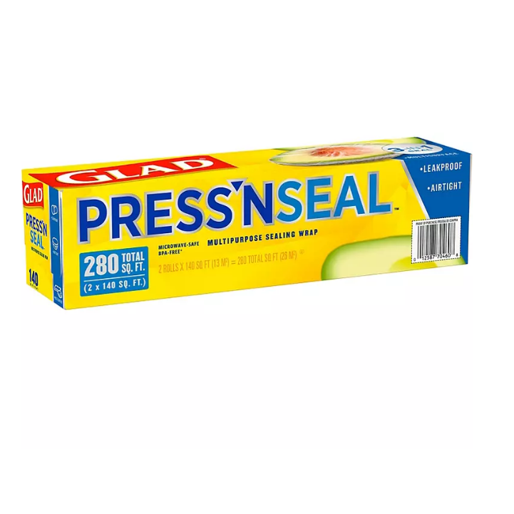 Glad Press’n Seal Plastic Food Wrap (140 sq. ft./roll, 2 rolls) uses Griptex technology to protect food with a leak proof and airtight seal. Great for storing and protecting leftovers, this multipurpose 3-in-1 wrap seals tightly onto a variety of surfaces, such as paper, plastic, metal, wood, glass or other dry surfaces. The Griptex? technology activates when pressure is applied and seals to itself, allowing you to create custom shaped food storage bags to freeze food or to make individual portions. With a quick press of a finger, Glad Press’n Seal Food Wrap keeps food fresh with a leak proof, air tight seal. It even has 10x tighter seal vs foil alone* and is durable enough for you to stack on top.