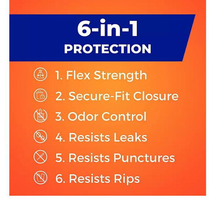 - 6-in-1 protection provides flex strength, secure-fit closure, odor control, and resists leaks, punctures, and rips