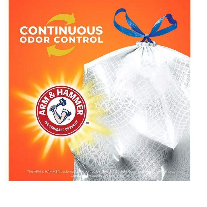 These durable trash bags were designed to be used for everyday cleanup, from picking up after an event to collecting items for donation. These versatile trash bags are made ultra-strong to handle all kinds of projects around the house. Don’t be afraid to use these 13-gallon kitchen trash bags for tougher jobs, such as garage or basement cleanup. A break-resistant grip drawstring makes it easy to close the bag securely and cart it away without incident. As a bonus, these scented trash bags include patented Arm and Hammer** continuous odor control and a wonderful Fabuloso* scent to keep unpleasant smells at bay.?