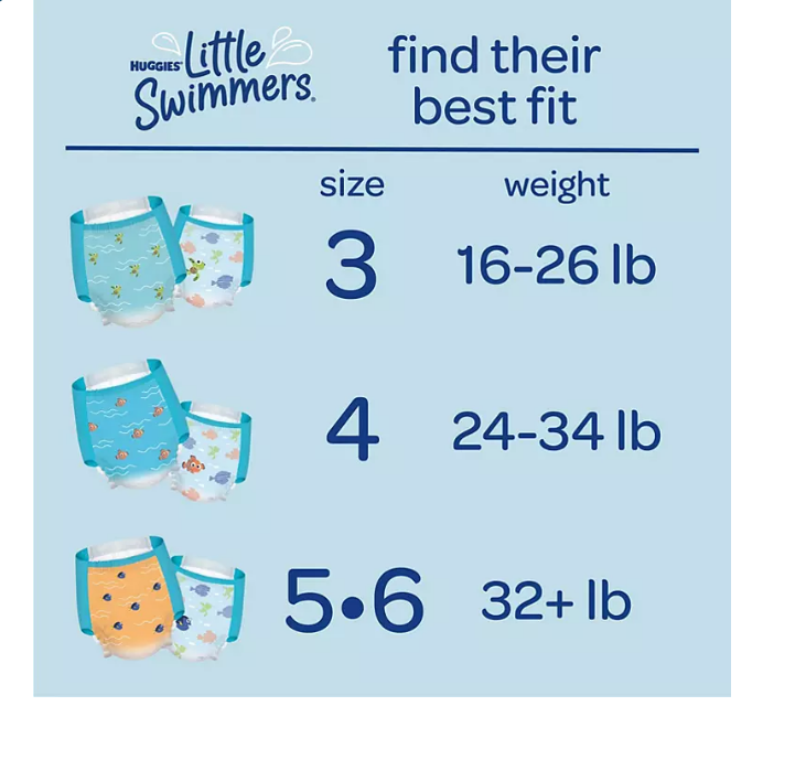 Huggies Little Swimmers are available in sizes 3 (16-26 lbs), 4 (24-34 lbs) and 5-6 (32+ lbs). For daytime protection outside of the pool, try Huggies Little Movers Baby Diapers. For nighttime protection for your little one, try Huggies Overnites Baby Diapers.