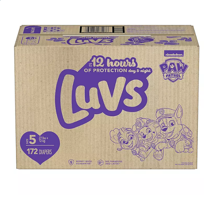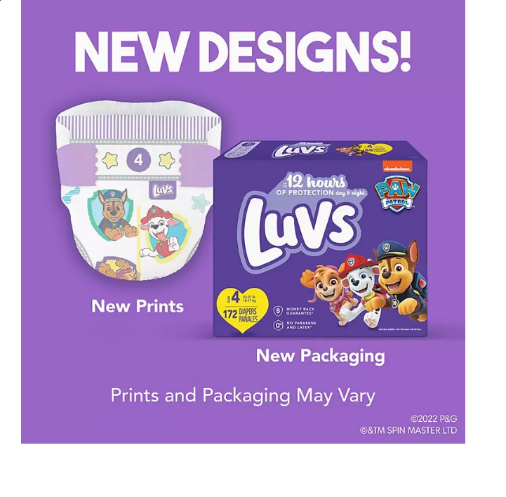 No job is too big, no pup is too small! Luvs diapers with new Paw Patrol designs have your back―and their butts. Luvs now has up to 12 hours of protection, day and night. Like Chase and Marshall would say, our highly trained paws are at your service. And diaper leaks? We’re on the case with nonstop leak protection. Luvs Triple Leakguards absorb quickly to help stop diaper leaks before they happen. But our leak protection doesn’t stop there. Secure cuffs and stretchy sides keep leaks locked in where they happen the most. Forget about cheap, leaky diapers and spend more time enjoying this ride known as parenting. With Luvs you know when they go, thanks to a wetness indicator that turns blue on contact with wetness. You care what your baby wears, so Luvs diapers are 100% hypoallergenic, made free of parabens and free of latex* (*natural rubber). When it comes to the ultimate diaper protection, these paws uphold the laws. Our diapers are so good, you don’t need this, but Luvs does offer a money-back guarantee. If you aren’t fully loving your Luvs diapers, we will gladly send you a refund. See luvsdiapers.com for terms and conditions.