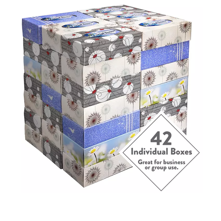 - Over 4,600 premium 2-ply tissues in 42 decorative boxes