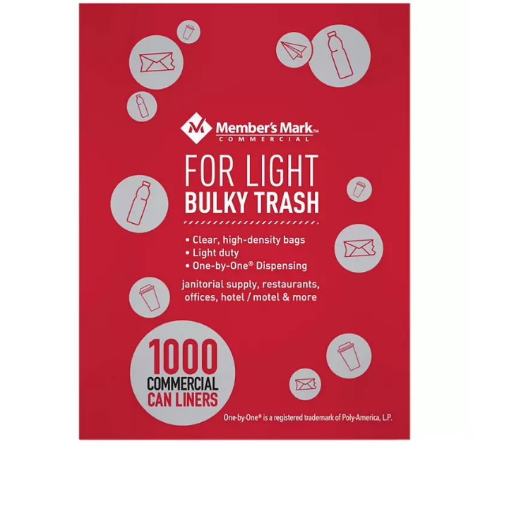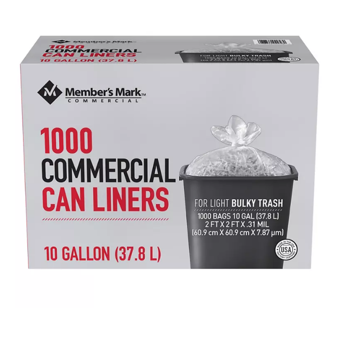 Stock your workplace with Member’s Mark? 10 Gallon Commercial Trash Bags. They’re suitable for use in schools, offices, hotels and other commercial establishments where trash needs to be taken out daily. These clear 10-gallon trash bags are designed for commercial use and are designed for light and bulky trash. This pack of trash bags contains ten 100-count rolls, for a total of 1,000 bags.