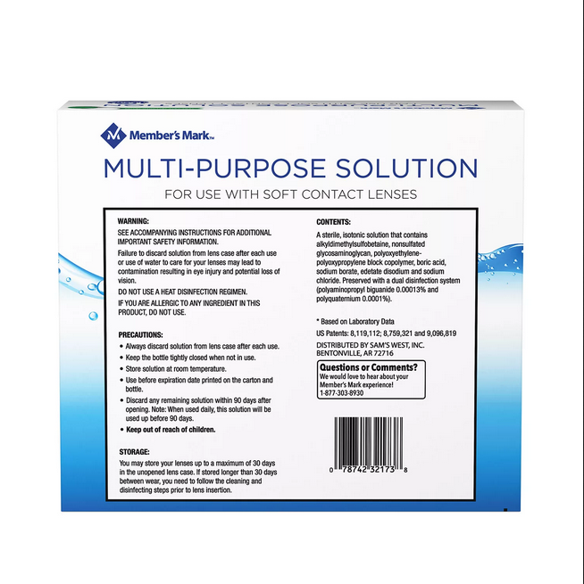 When used daily, Members Mark Multi-Purpose Solution dissolves protein and cleans, loosens, and removes accumulations of film, debris and deposits from soft and silicone hydrogel contact lenses. Members Mark Multi-Purpose Solution helps prevent the formation of irritating deposits on the lens surface. It kills harmful microorganisms on the lens. While your lens is soaking, the formula envelops the lens in a moisture-rich cushion to help the lens remain comfortable throughout the day. Members Mark Multi-Purpose Solution can also be used to rinse lenses. Members Mark Multi-Purpose Solution is not approved as a rewetting drop for direct in-the-eye use. If any debris remains on contact lenses, rinse with Members Mark Multi-Purpose Solution prior to insertion.