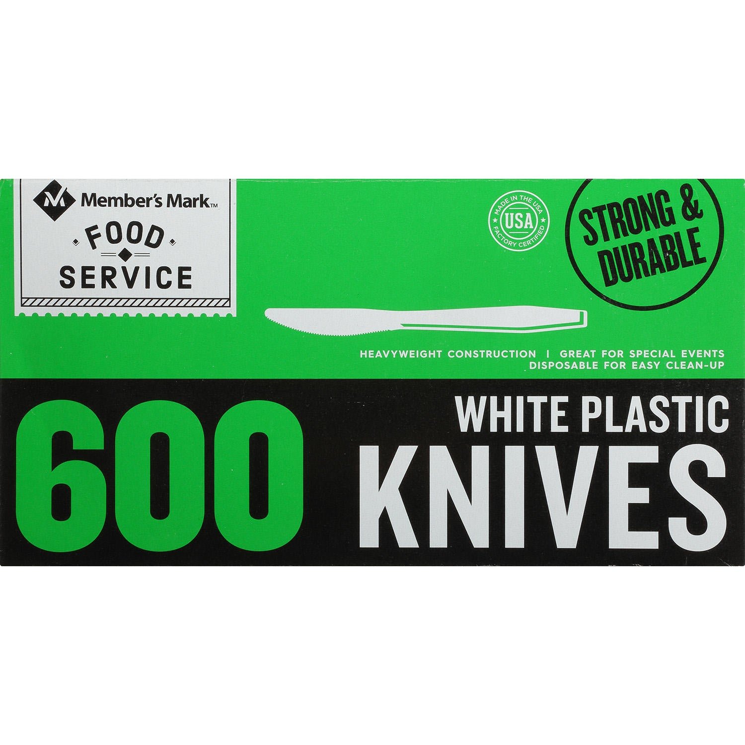 Member’s Mark? Plastic Knives, Heavyweight, White (600 ct.) are strong, reliable knives that you can count on at home, in the office or out on the go. This giant 600 pack of heavy duty plastic silverware will keep you stocked up and ready to serve hundreds of meals. Be sure to look for Member’s Mark plastic spoons and forks as well.