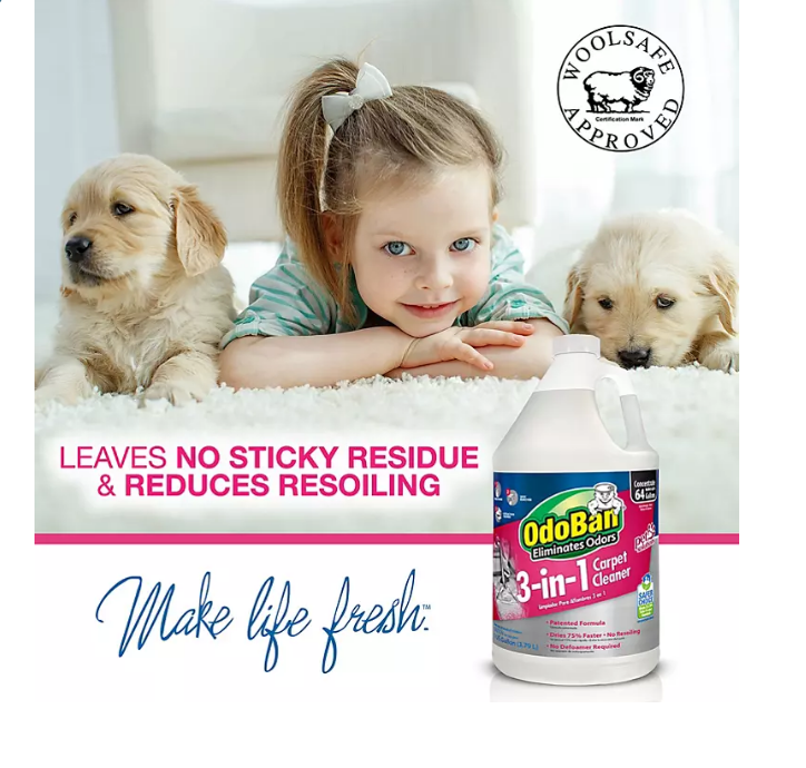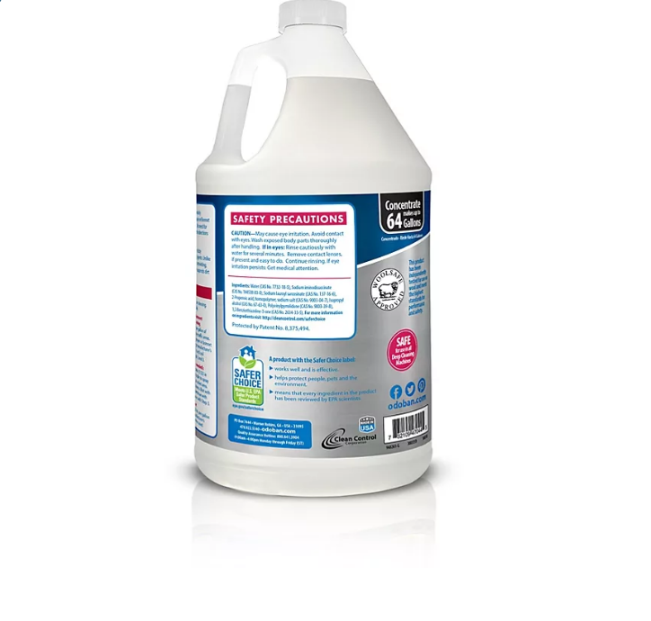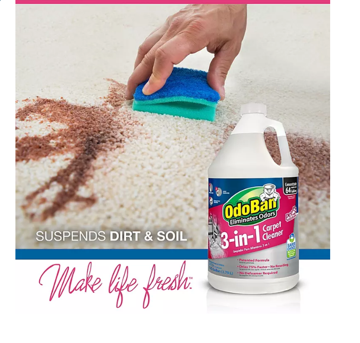 OdoBan 3-in-1 Carpet Cleaner is a concentrated carpet cleaning solution that uses safer ingredients to effectively deep clean carpets. Works as three products in one: a traffic lane pretreatment, extraction cleaner and spot remover. Cleans carpet without the use of foamy, harmful or sticky chemicals. This product’s patented formula technology reduces wear and tear to carpets by suspending dirt and soils, drying 75% faster than traditional carpet cleaners. This unique formula eliminates the need for separate pre-sprays, spot removers, defoamers or additional rinsing agents. Does not promote resoiling, fiber untwisting or matting. Use as a carpet extraction cleaner solution, safe for use in all carpet cleaning machines. WoolSafe approved, safe to use on wool carpet. Concentrated formula makes up to 64 gallons of carpet cleaning solution. Dilute as directed on label before use.