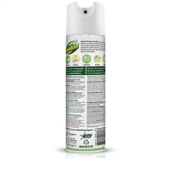 OdoBan Ready-to-Use Continuous Spray?is a multi-purpose cleaner, disinfectant, sanitizer, air freshener and odor eliminator. Features 360° Pure Air Continuous Spray technology that uses natural air non-flammable propellant to spray at all angles- even upside down! OdoBan is a disinfectant that kills germs, bacteria and viruses when used according to disinfection/sanitization directions on hard, nonporous surfaces. Removes odors, including pet odors, urine odors, smoke odors, and musty odors. Instantly freshens and deodorizes fabrics, like clothing, shoes, furniture, upholstery, bedding, carpets and rugs. Use as a home or car air freshener and odor remover.? Renews automobiles; removes car odors, RV odors, mobile home odors, and camper odors like cigarette smoke smell and animal smell. For use on walls, tables, floors, carpets, toilets, grout, sinks, drains, bathtubs, countertops, appliances, furniture, drapes, laundry, bedding and more. When used as directed, OdoBan is safe for use on washable surfaces, including sealed natural stone, stainless steel, ceramic, tile, rubber, vinyl, and plastic. Safe for use on sealed natural stone countertops and surfaces, like granite, quartz, marble, ceramic and soapstone. Deodorizes carpets, removing pet urine smells, food smells and musty smells. Use in showers or basements to control mold and mildew; removes mildew odors. Excellent for water damage, sewage backup, fire and flood restoration. It is streak free and leaves no residue.