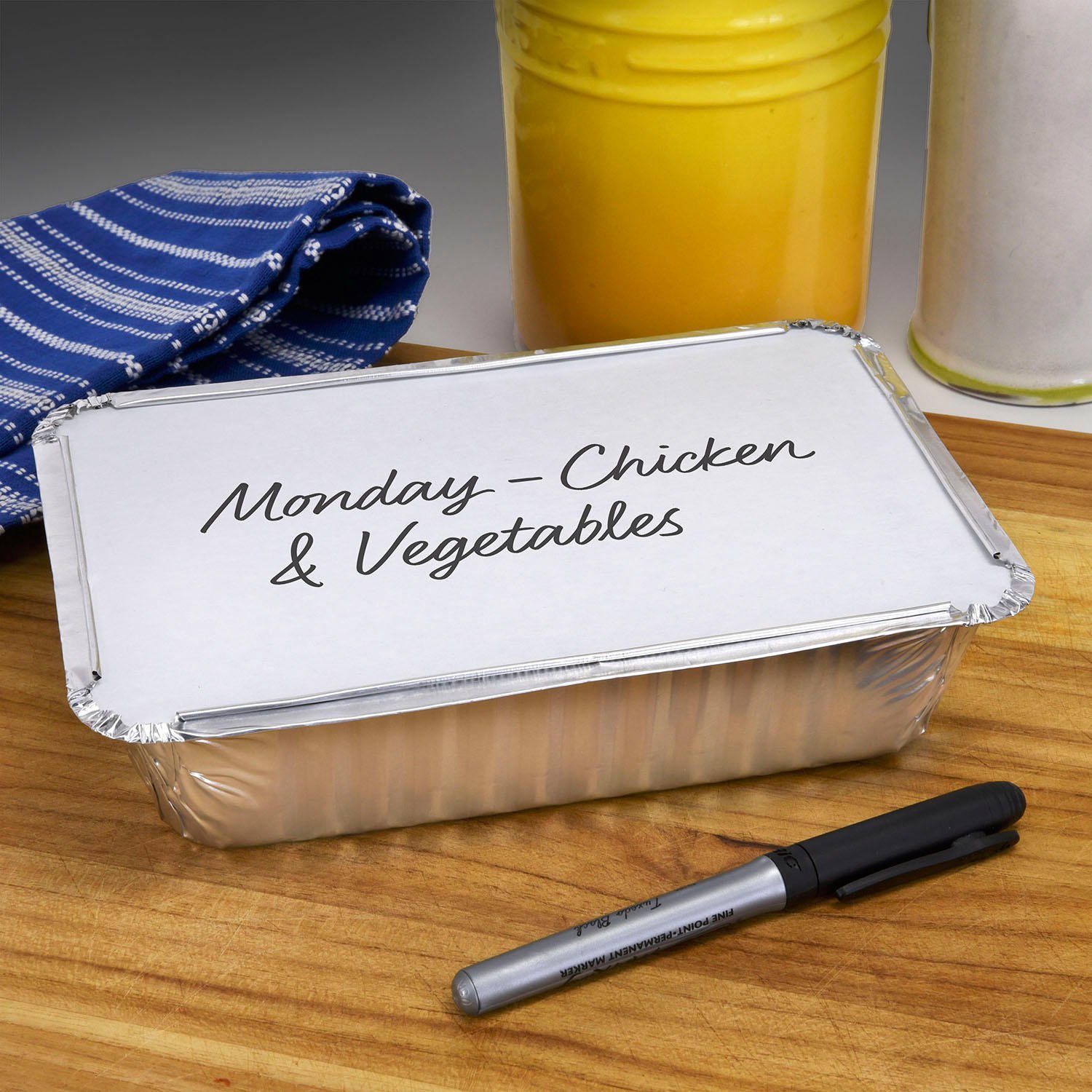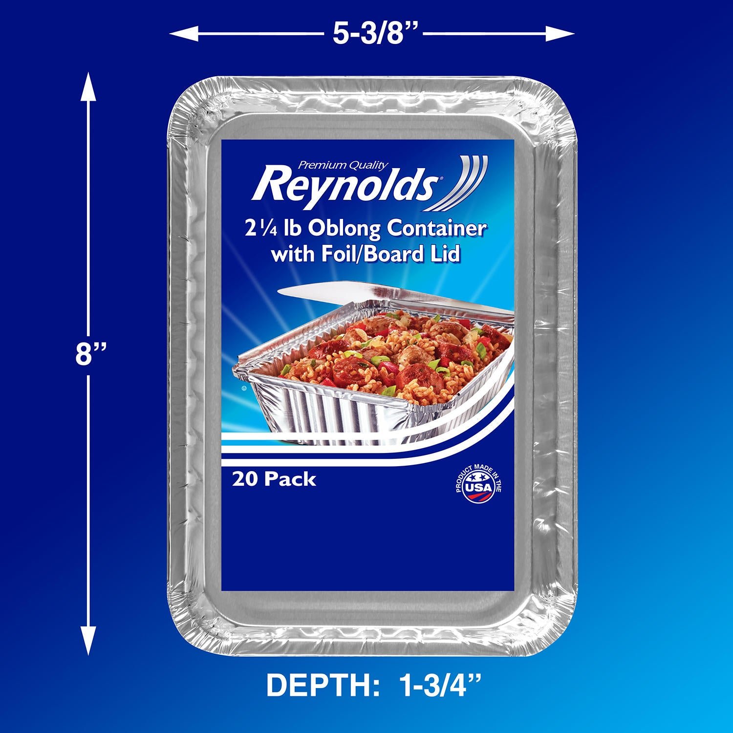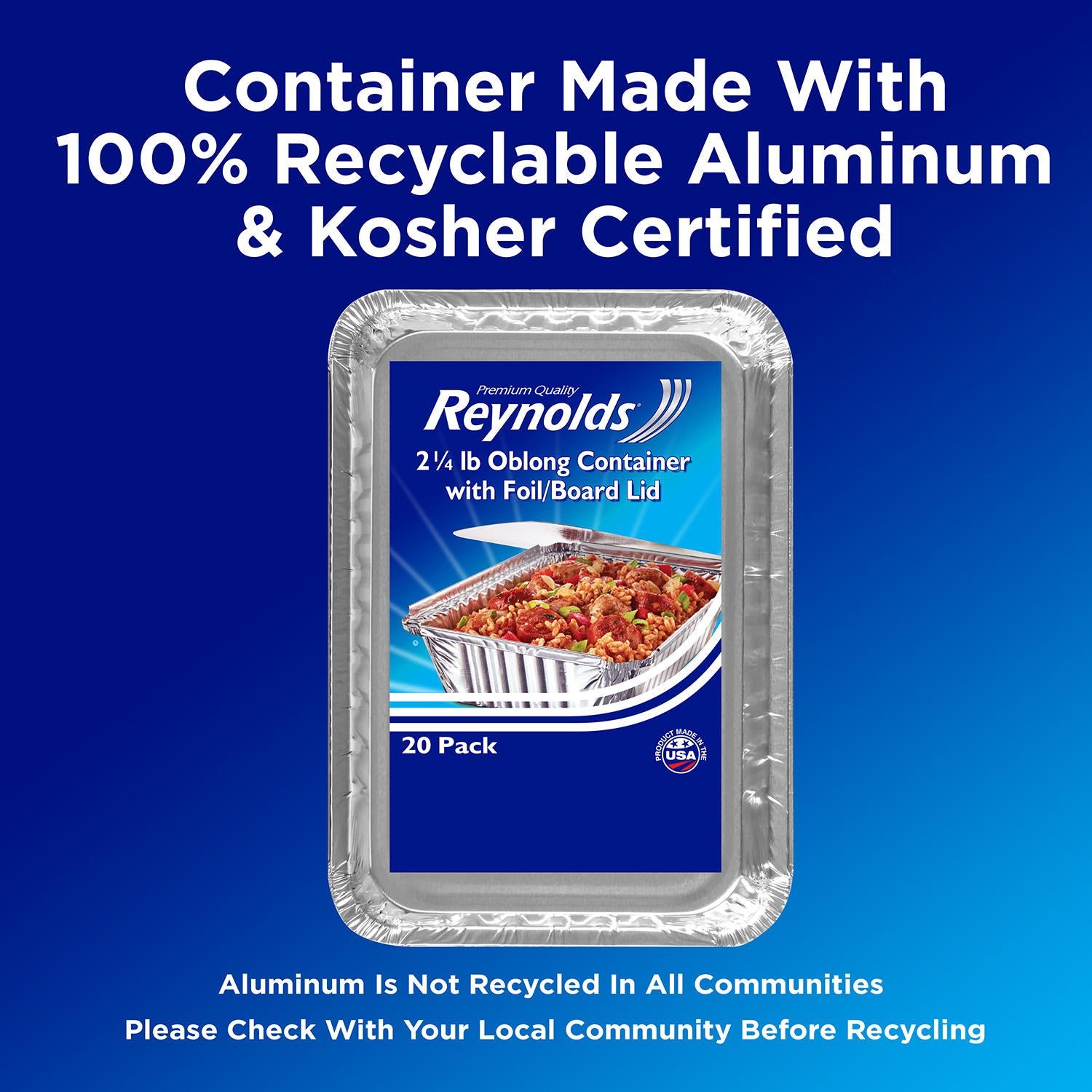 Reynolds Oblong Foil Take Out Containers with Lids contains 20 foil take-out containers and 20 board lids, measuring 8″ x 5.375″ x 1.75″ and holding 2.25 lbs of food. These to-go containers are perfect for packing leftovers, make-ahead meals and food on-the-go. Board lids are included for a tight seal and make a great place to label the contents of the container. Built strong and sturdy, these pans are made from 100% recyclable aluminum and are kosher certified. Aluminum is not recycled in all communities, so please check with your local community before recycling.