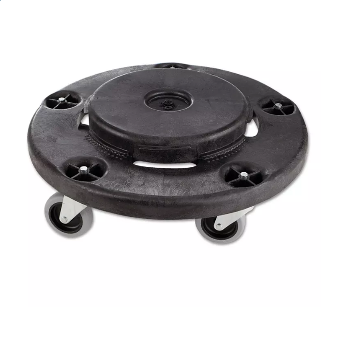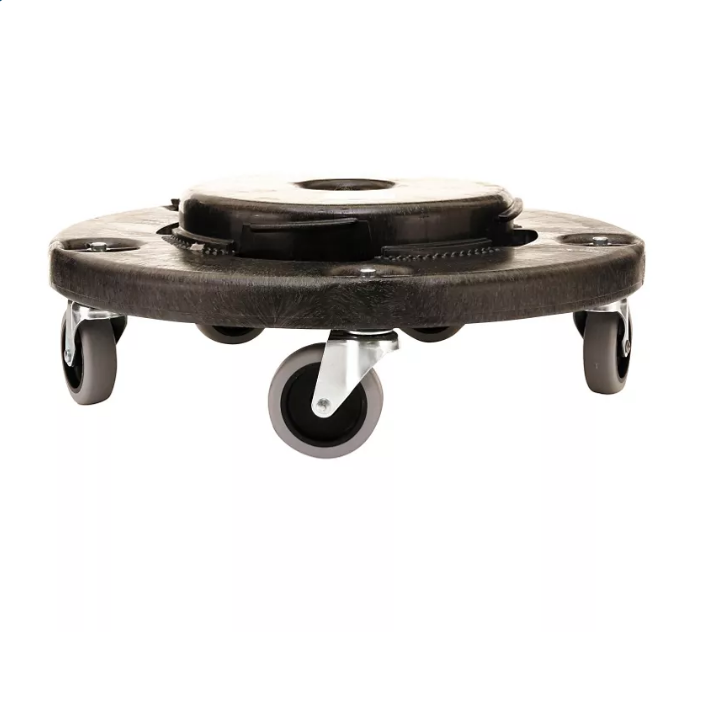 The Rubbermaid Commercial BRUTE? Trash Can Dolly provides a steady, mobile base for BRUTE trash cans from 20 to 55 gallons. 5 rugged, non-marking casters move fully loaded BRUTE trash cans smoothly even across rough and uneven surfaces. Constructed of sturdy structural foam, these garbage can dollies can transport up to 250 lbs. quickly and quietly through any facility while an innovative twist-lock design keeps receptacles securely mounted on the dolly. Capacity (Weight): 250 lbs; Caster/Glide/Wheel Type: Swivel Casters; Color(s): Black; Dolly Size: 18″ dia x 6.63″; For Use With: Brute? 20-Gallon, 32-Gallon, 44-Gallon, and 55-Gallon Round Waste Containers; Number of Wheels: 4 Recycled Comments: Contains a minimum of 30% post-consumer recycled content.