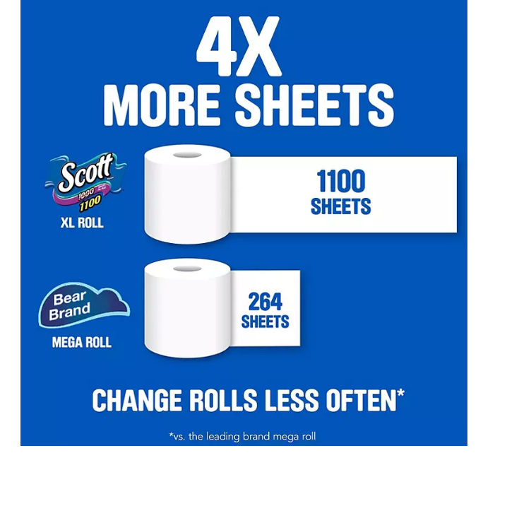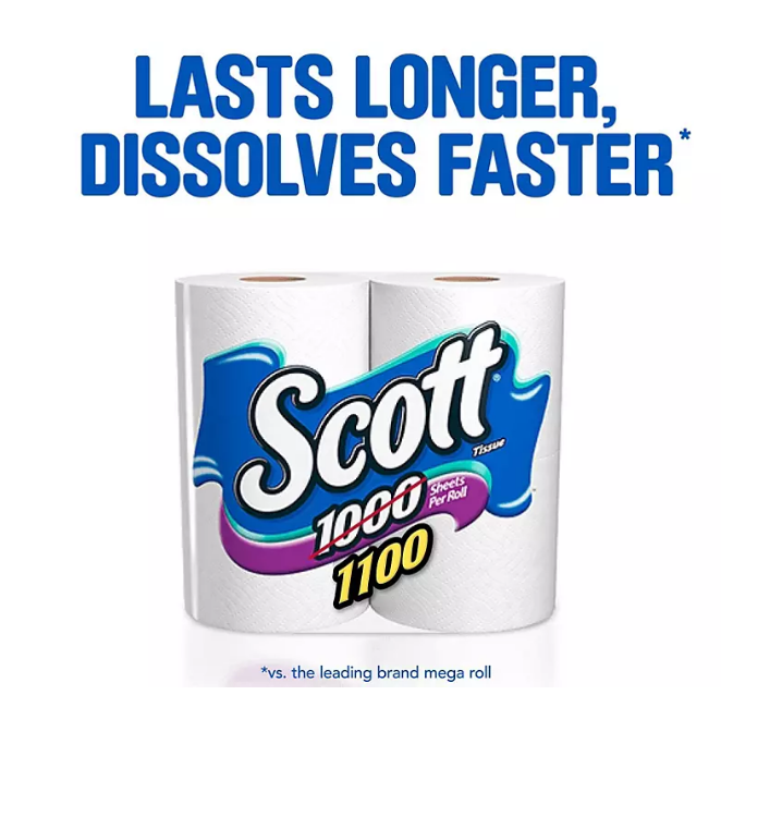 Scott 1100 Toilet Paper helps you spend time on what matters most with fewer roll changes and more value. With Scott 1100 Toilet Paper, you get 36 packs of 1100 sheets, so you have plenty of toilet paper for you and your loved ones. Plus, each roll of Scott 1100 bathroom tissue helps you get the job done with 1,100 durable 1-layer sheets and lasts longer, dissolves faster* and breaks down 10x faster**.?