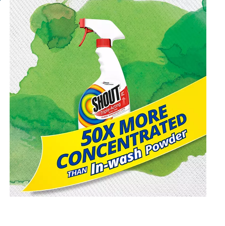 Shout Triple-Acting Laundy Stain Remover is 50x more concentrated than in-wash powder* and works on a wide range of everyday stains like food, grass, dirt and blood. Safe for all colorfast washables and works in all water temperatures. This formula is also compatible with HE and standard washing machines.