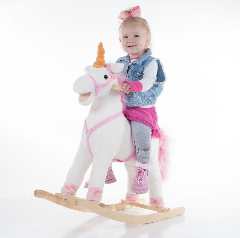 The Plush Unicorn Rocker from Toy Time is a stuffed unicorn on a sturdy wood base that will help children expel extra energy in the comfort of their own home. Kids aged 3 and up can hop into the saddle of this soft white and pink unicorn and ride for fun imaginative play. This rocker is designed for use on flat surfaces and under the supervision of an adult.