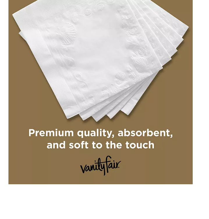 Soft and strong with a premium, cloth-like texture, Vanity Fair? Entertain Paper Napkins make it easy to turn your ordinary meal into an extraordinary meal. These napkins look elegant paired with your flatware and dinnerware or arranged in a fanned stack at the head of a buffet table.?